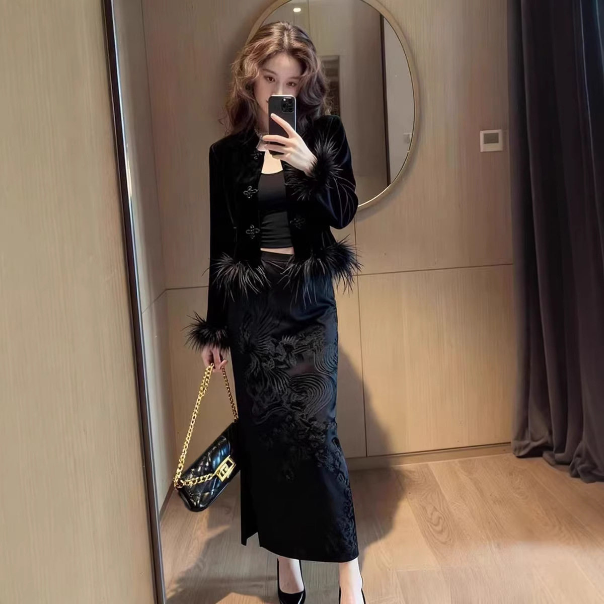 2026新款高端国风黑色丝绒冬装套装女款新中式时尚精致外套裙装潮