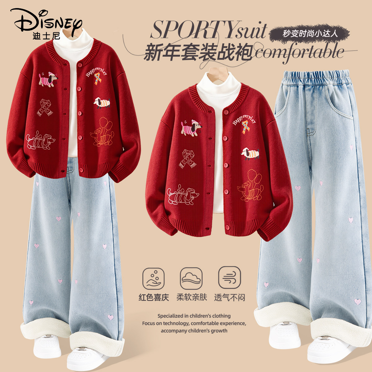 迪士尼女童套装冬季2026新款小狗毛衣休闲时尚潮流儿童冬装裤子厚