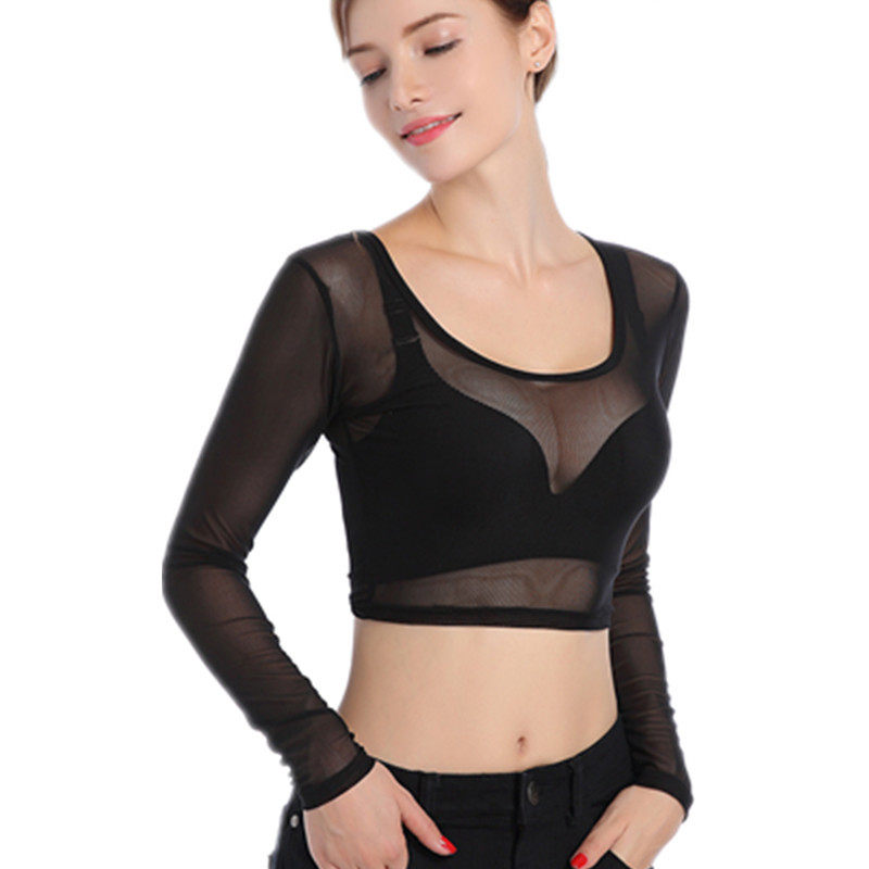 半截内搭透明纱衣圆领紧身黑色夜店性感透视网纱长袖打底衫女短款