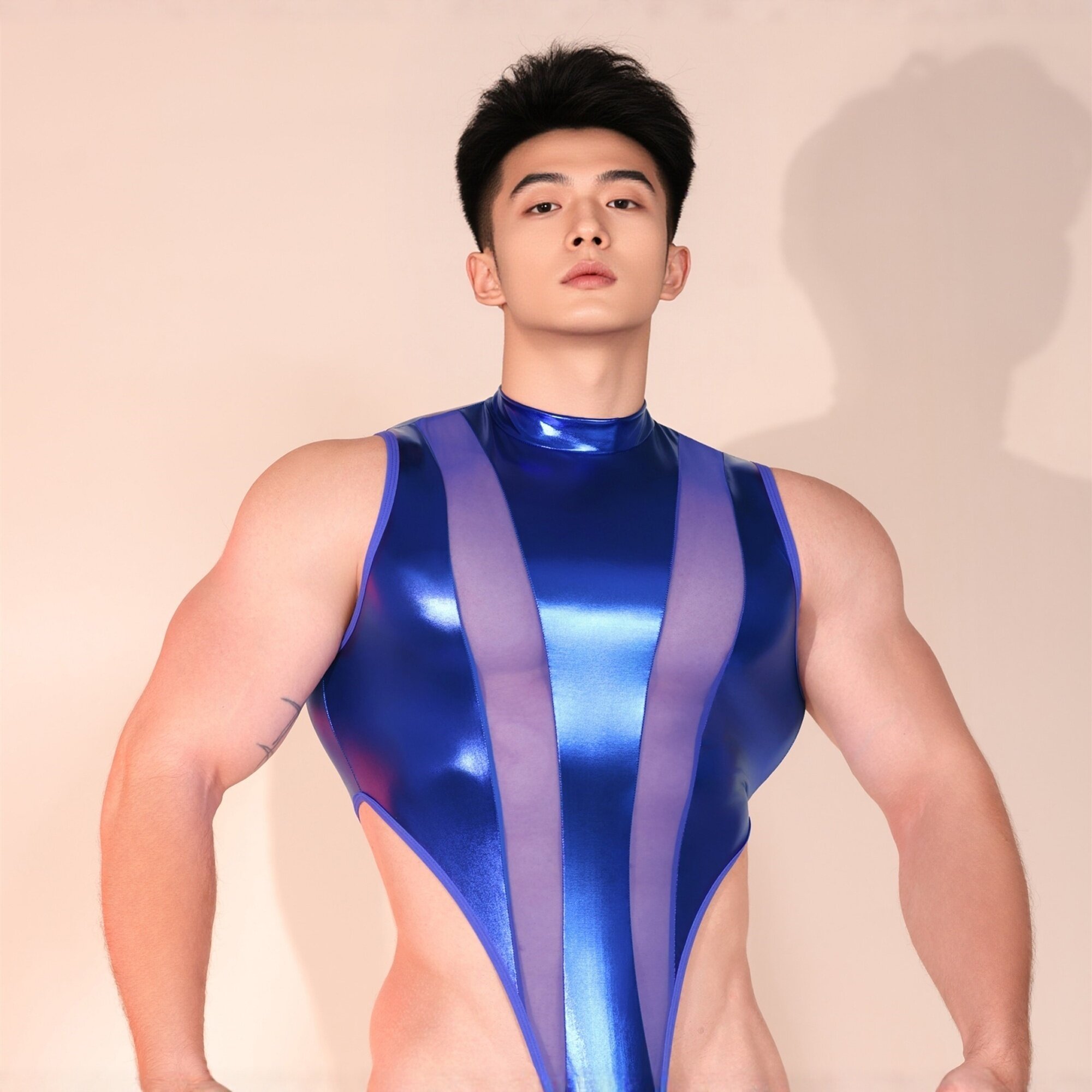 男士性感透视网纱拼接塑身连体衣高弹紧身夜店酒吧表演服欧美男生
