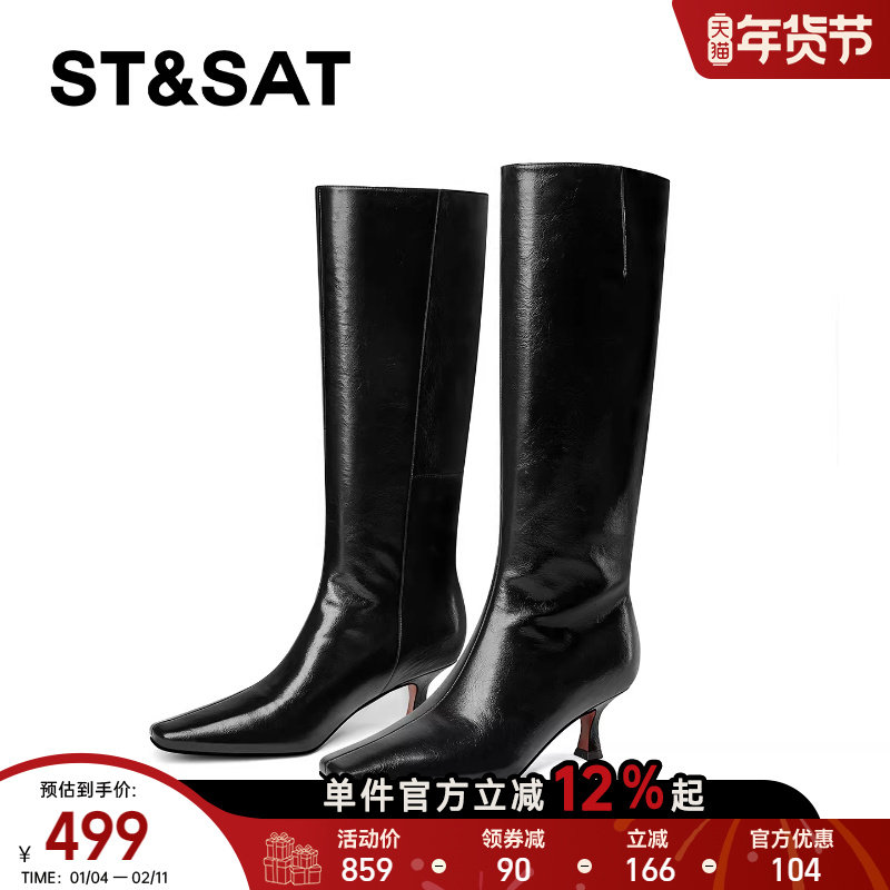 星期六黑色长筒靴女2025秋冬尖头不过膝长靴小猫跟真皮高跟骑士靴