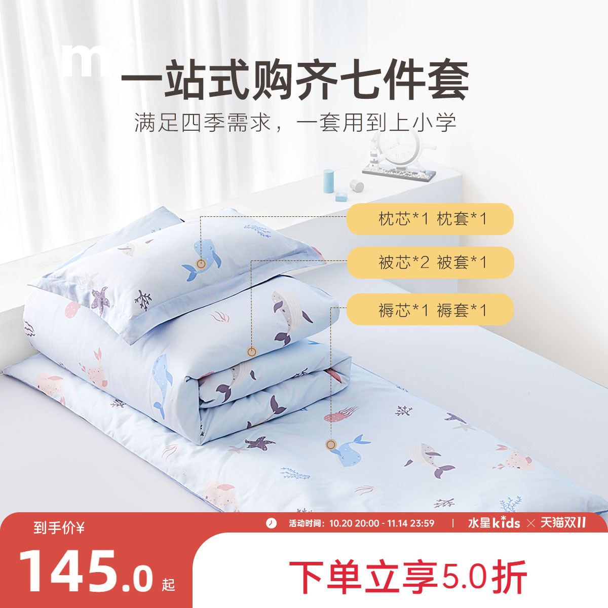水星儿童四件套A类100纯棉男孩床上用品三件套儿童男童全棉儿童床