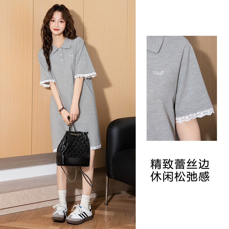 唐狮灰色休闲Polo裙连衣裙女2025夏季新款蕾丝花边设计拼接裙子g9