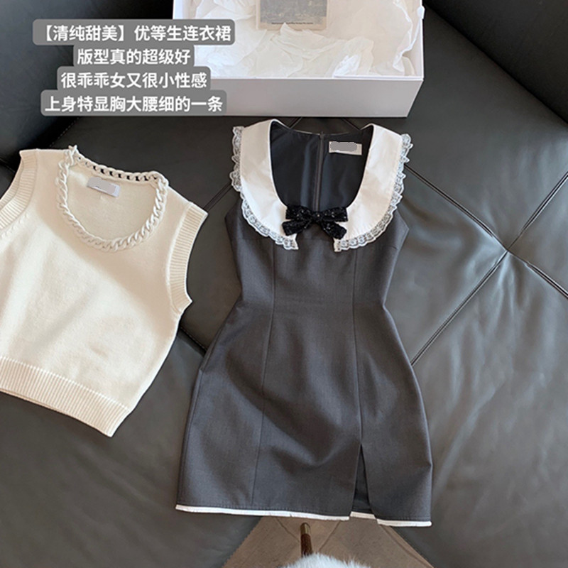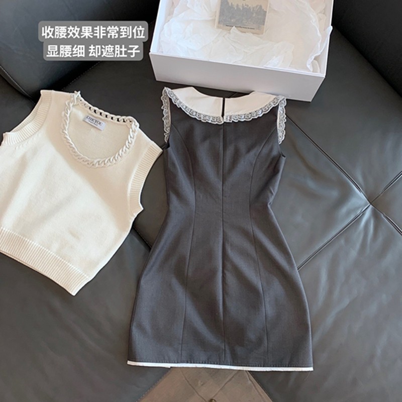 灰色蕾丝拼接内搭连衣裙两件套女2025冬气质韩系老钱风毛呢背心裙