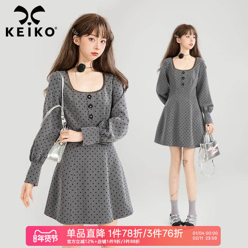 KEIKO 法式复古灰色波点连衣裙25秋季气质蕾丝花边U领收腰A字裙