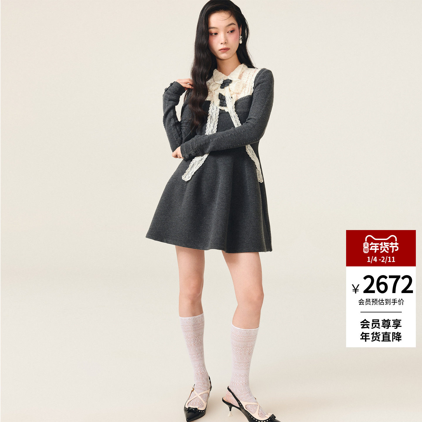 lefame拉飞姆2025冬季新款蝴蝶结飘带蕾丝拼接灰色针织长袖连衣裙