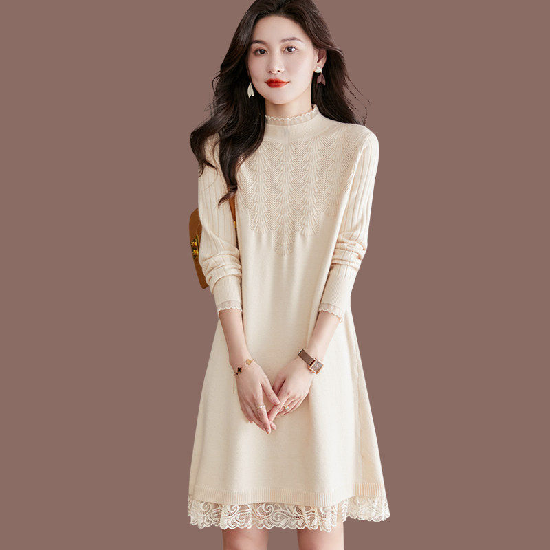 半高领蕾丝边秋冬新款女高级感灰色打底针织连衣裙时尚显瘦配大衣