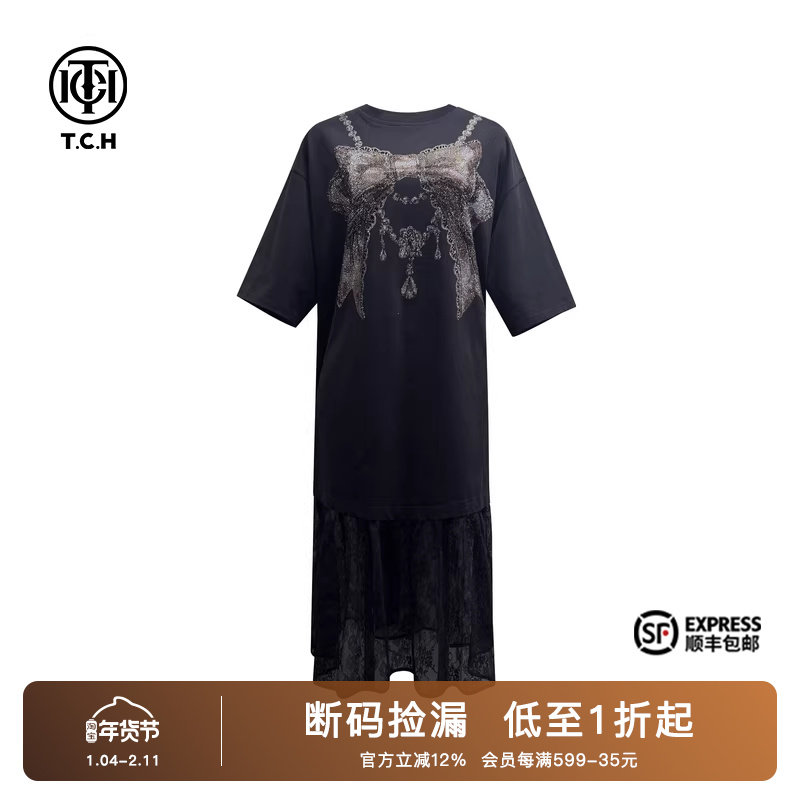 TCH潮牌轻奢时尚烫钻项链蝴蝶结蕾丝灰色连衣裙T75B30E1008