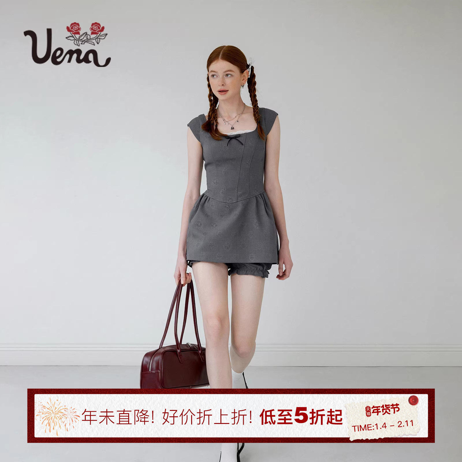 【山茶漫野】Uena美式复古灰色大方领蕾丝花边蝴蝶结连衣裙附短裤