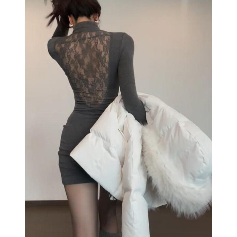 辣妹性感蕾丝露背连衣裙女秋冬新款设计感修身显瘦灰色包臀打底裙