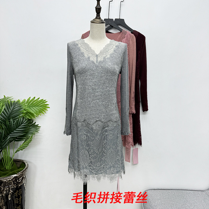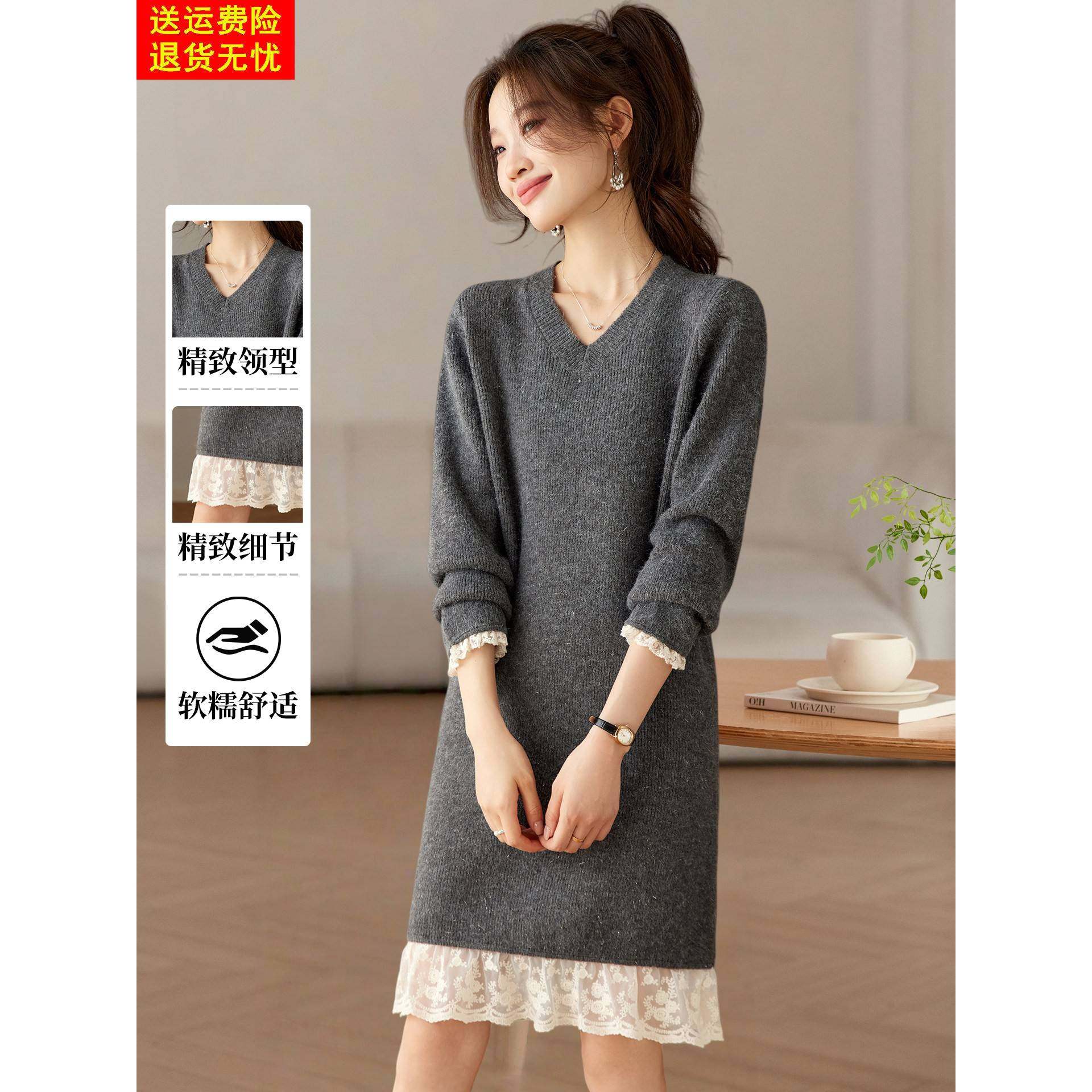 2025新款秋冬季蕾丝花边针织连衣裙女高级感气质灰色鸡心领毛衣裙