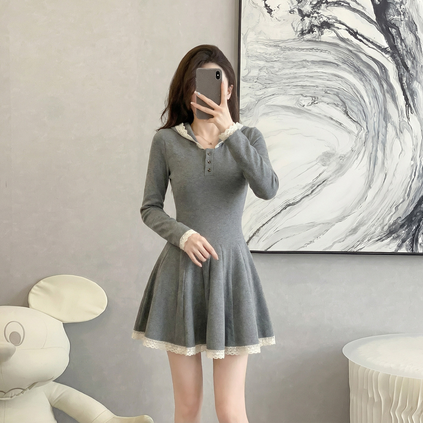 灰色辣妹长袖连衣裙女装秋季甜美蕾丝花边小个子气质收腰a字裙子