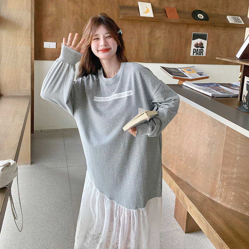灰色慵懒风卫衣裙女蕾丝拼接宽松长袖中长款连衣裙2026年春季新款
