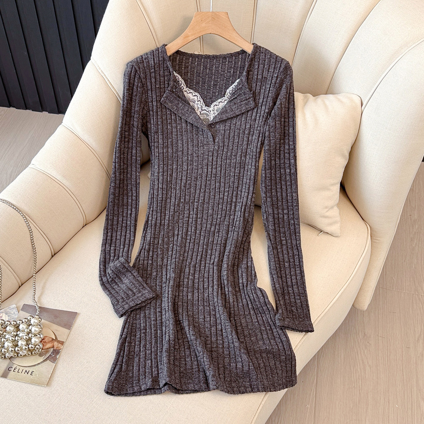 instahot 灰色性感蕾丝V领长袖连衣裙女秋冬新款修身内搭包臀短裙