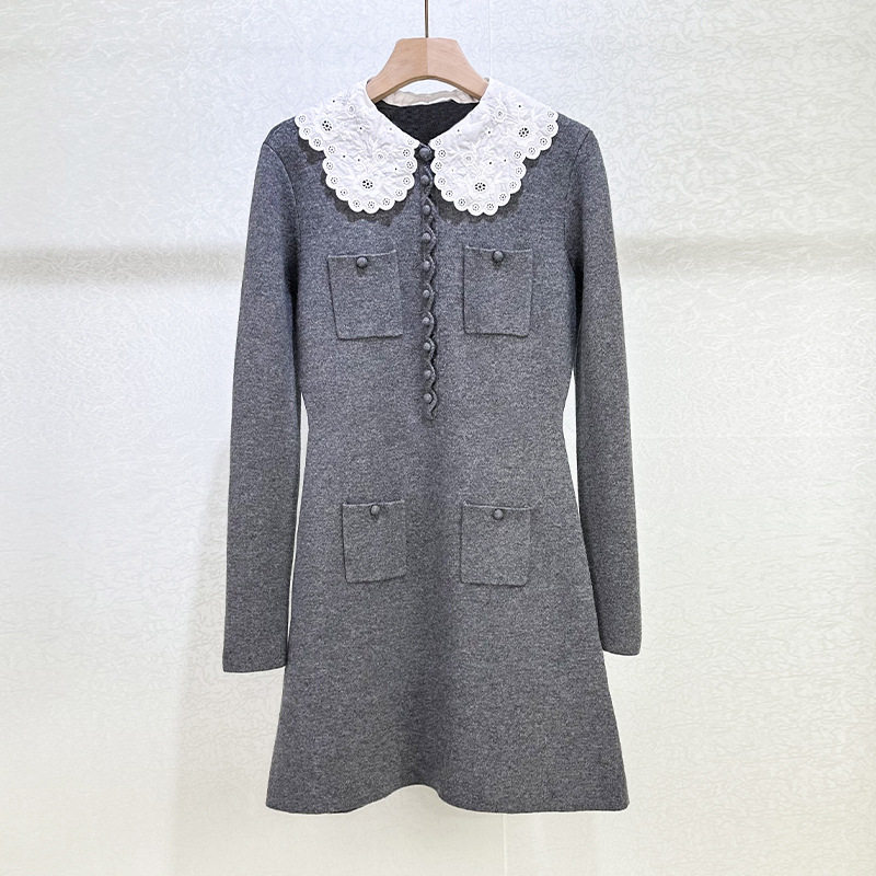 早春2026新款甜美减龄灰色可拆卸蕾丝娃娃领长袖修身针织连衣裙