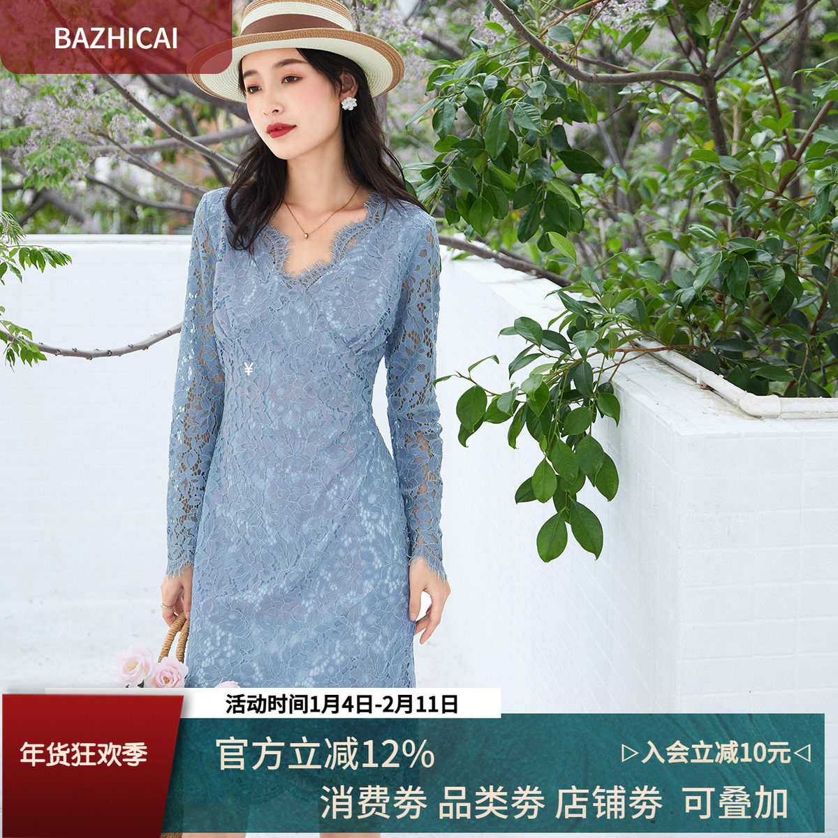 GirlsAt18灰色性感蕾丝V领长袖连衣裙女秋冬新款修身内搭包臀短裙