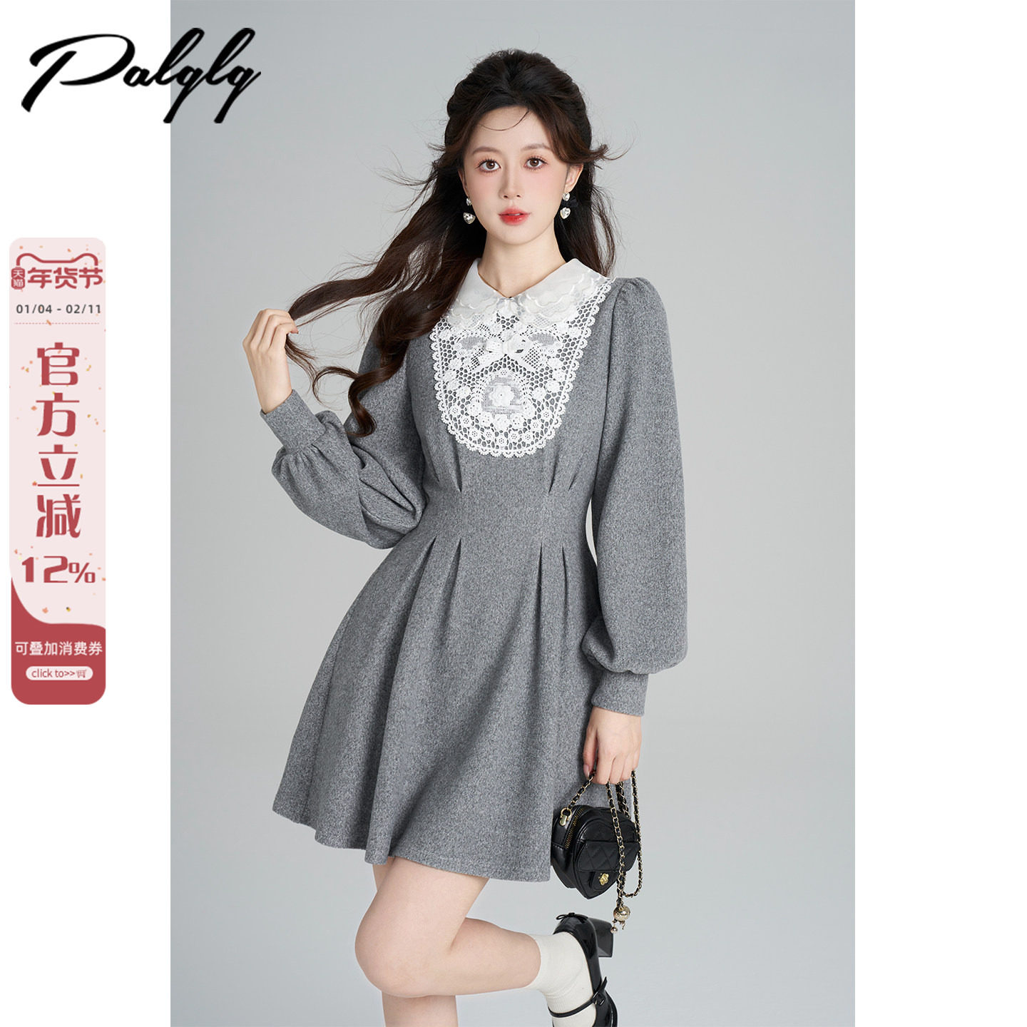 Palglg甜美拼接蕾丝灰色连衣裙女加厚冬季高级感收腰小香风裙子