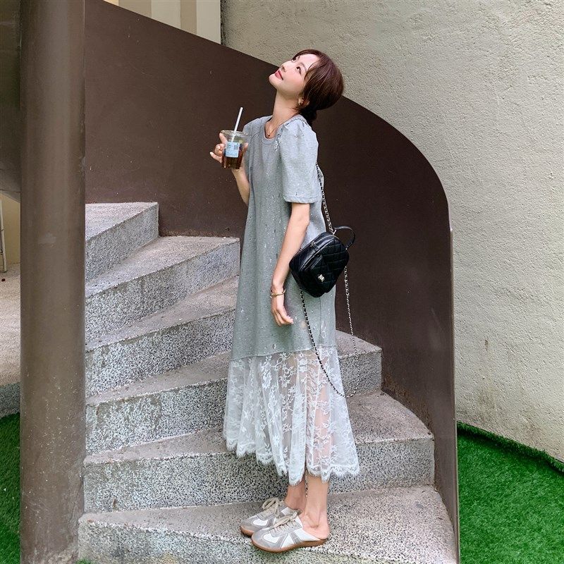 灰色蕾丝拼接T恤连衣裙女2025年夏季新款设计感独特漂亮减龄长裙