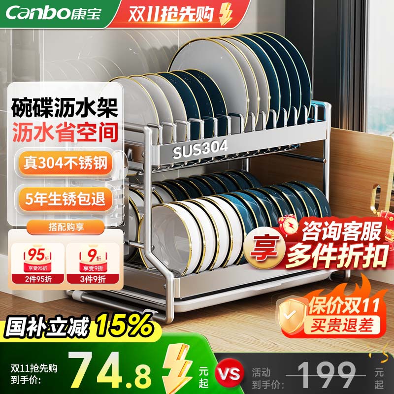 康宝304不锈钢厨房碗碟收纳架沥水架家用双层碗架碗盘餐具置物架