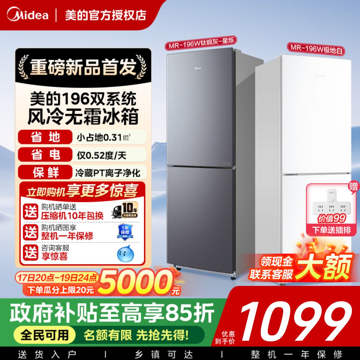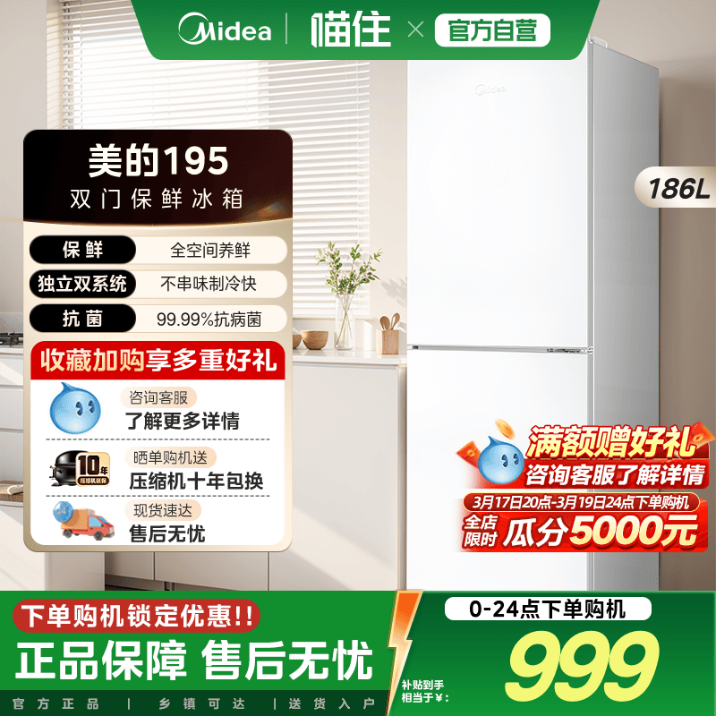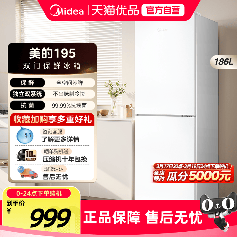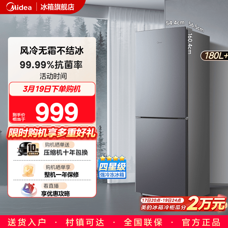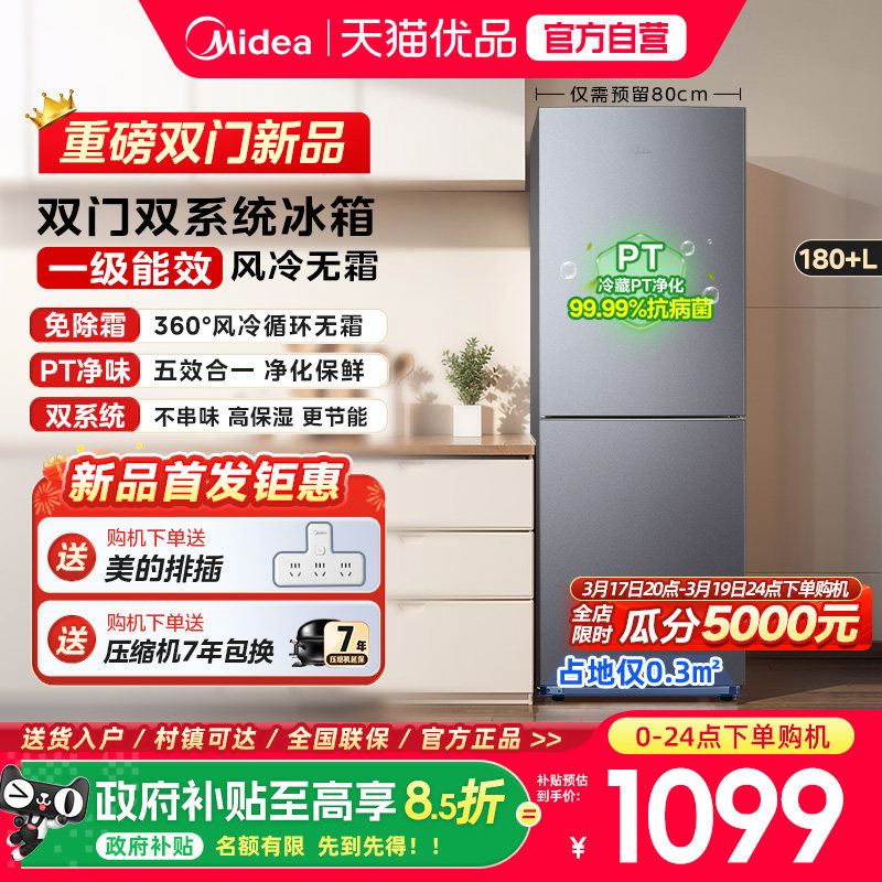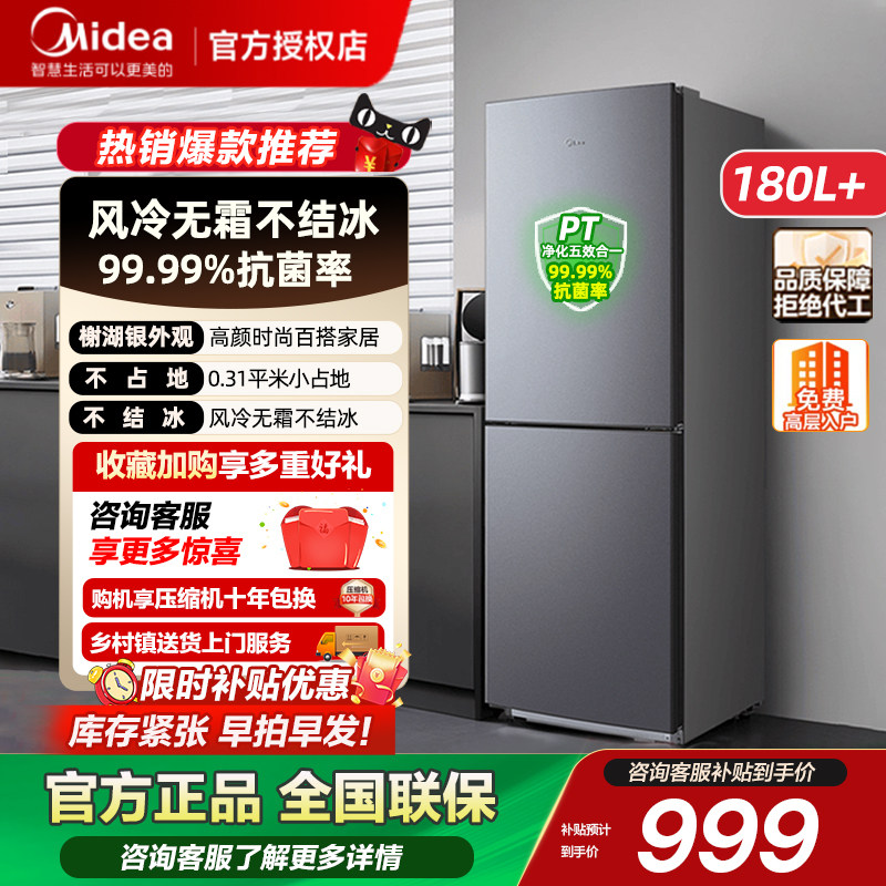 美的195/180+风冷无霜双门小户型冰箱官方家用小型出租屋宿舍节能