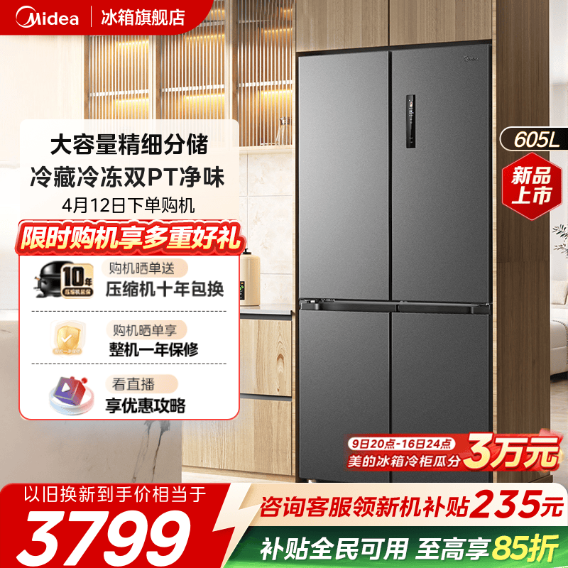 美的540/643/对开双开门大容量大冷冻零嵌入式家用冰箱以旧换新