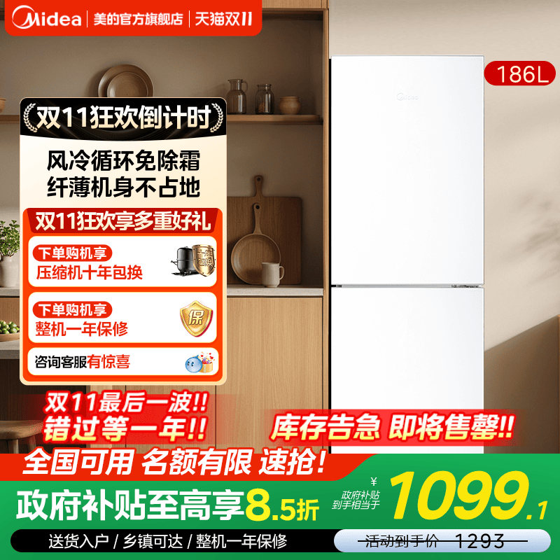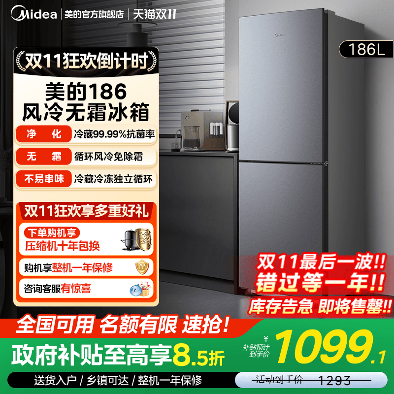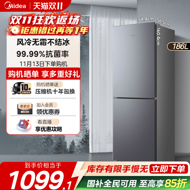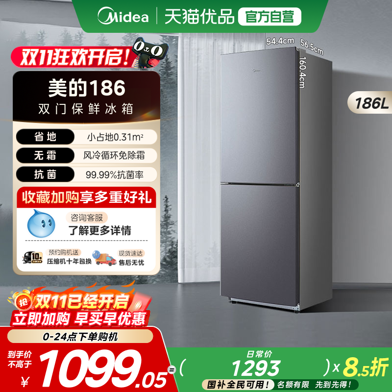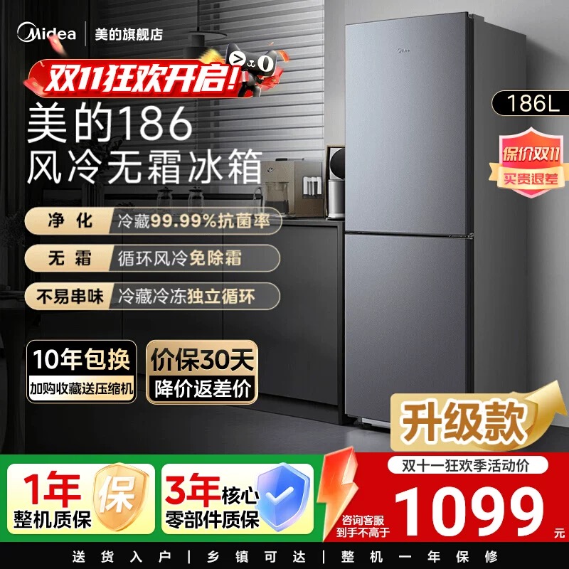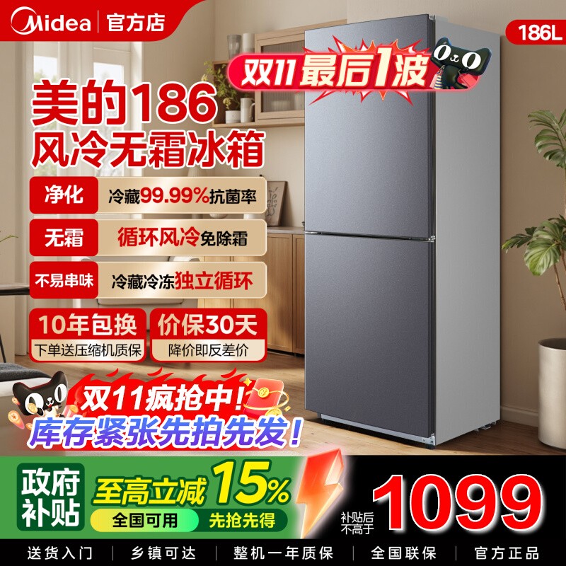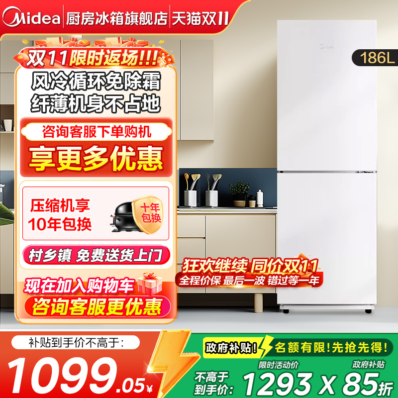 【全国补】美的186风冷无霜双门家用小户型节能低噪冷藏租房15%