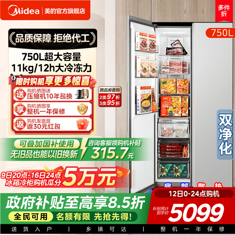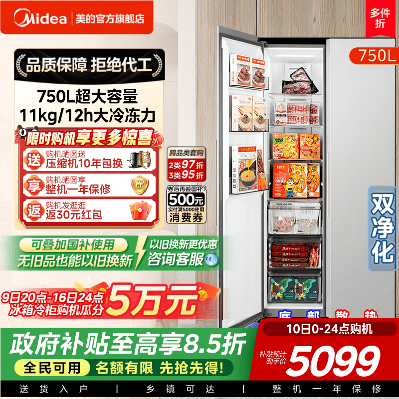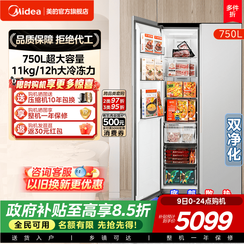 美的550L对开双开门大容量风冷无霜一级能效家用电冰箱官方旗舰店