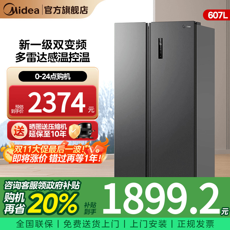 美的冰箱双开门对开门607L大容量变频一级能效无霜家用双门电冰箱
