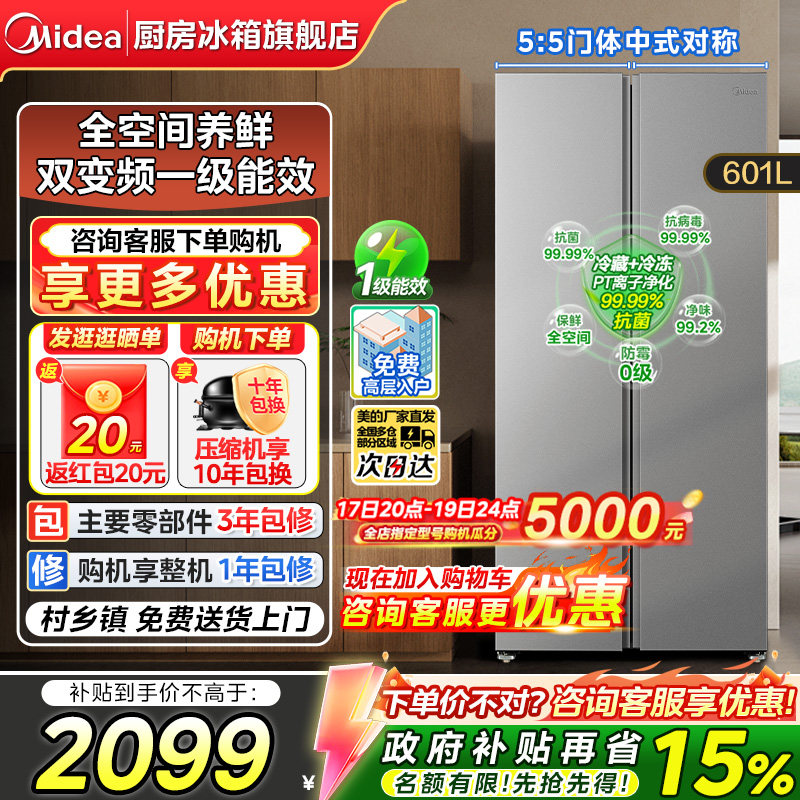 【政府补贴】美的601冰箱一级大容量对开门双门家用风冷无霜冰箱
