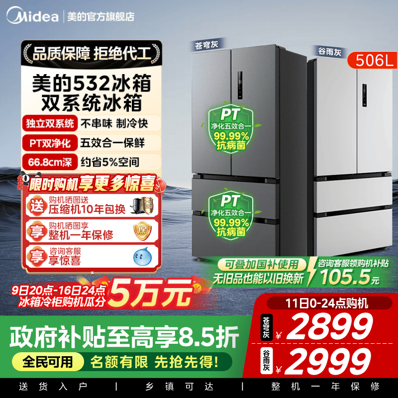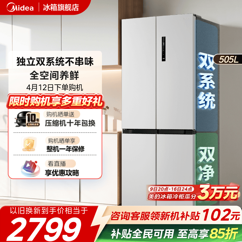 【双系统】美的531十字对开双开四门风冷无霜一级家用大容量冰箱