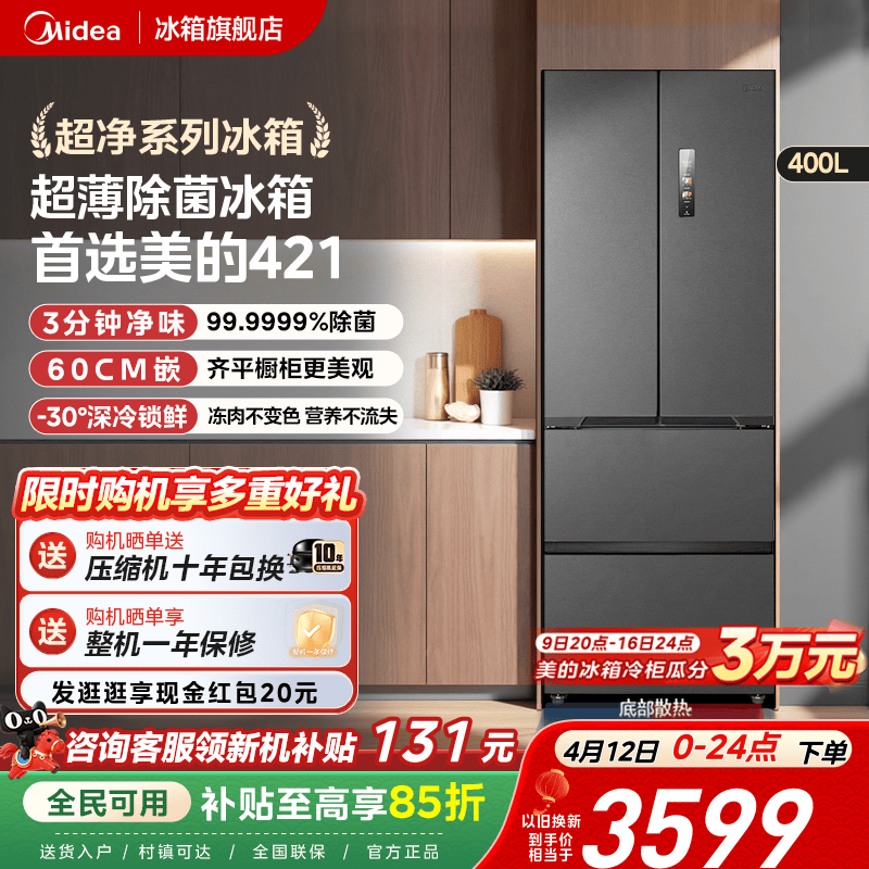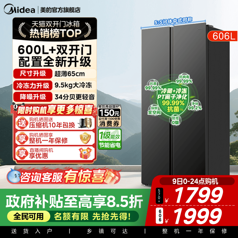 美的606对开双开门大容量超薄无霜变频嵌入家用冰箱以旧换新补贴