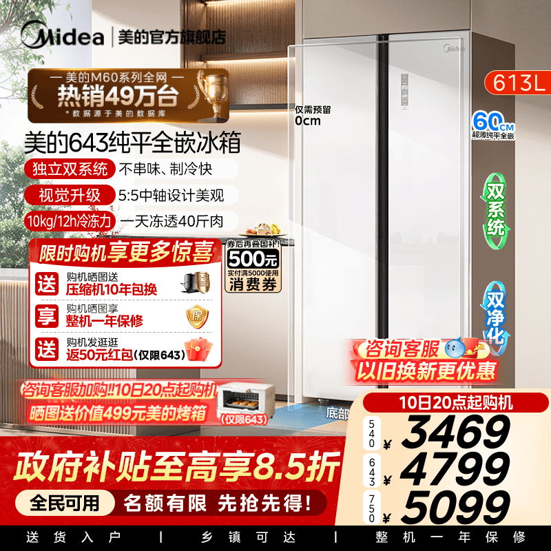 美的M60超净643超薄嵌入式双开门大容量冰箱家用双系统风冷无霜