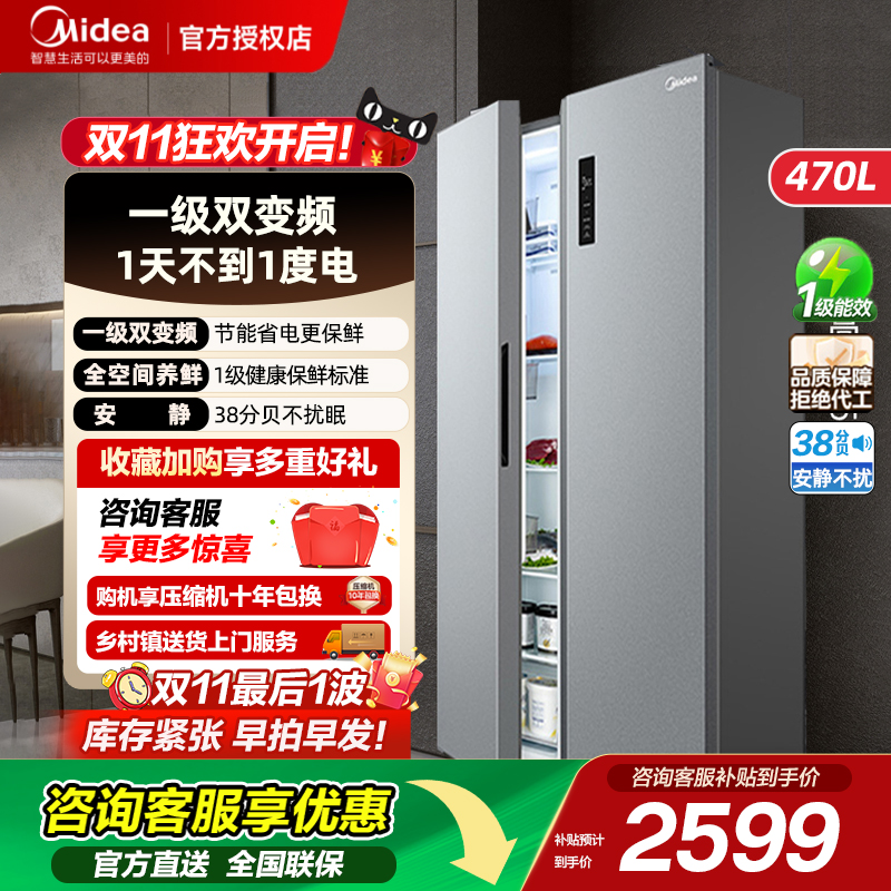 美的冰箱470L双开门对开门中型无霜变频一级能效家用双门冰箱超薄