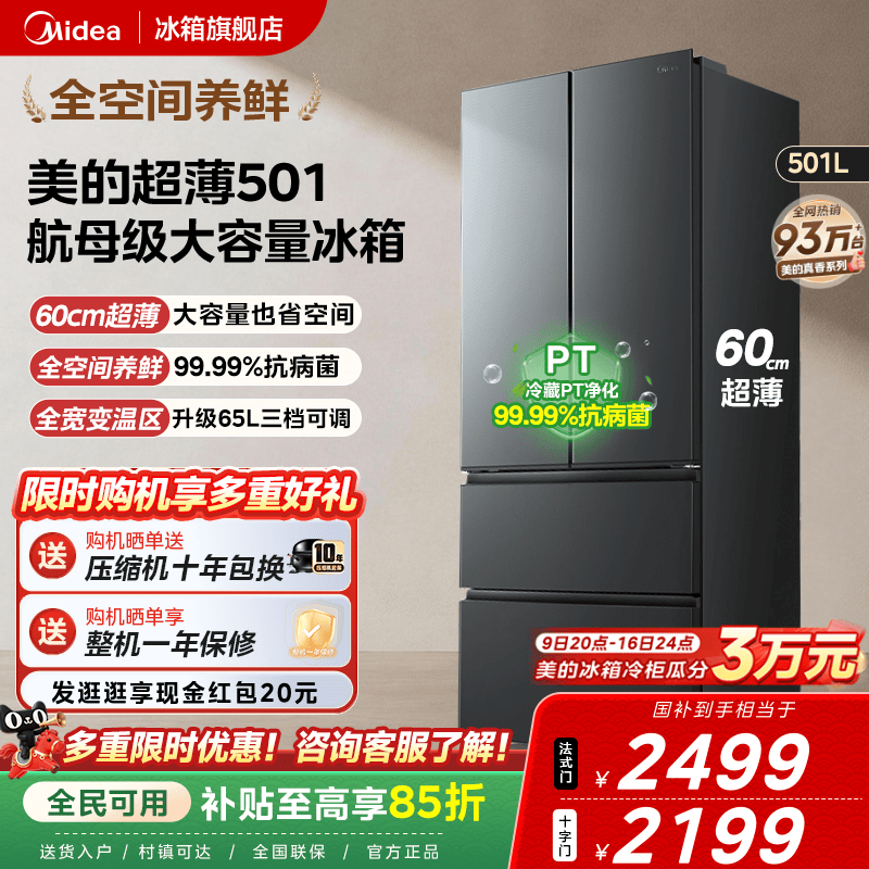 美的501双开门大容量法式60cm超薄四门家用一级变频冰箱风冷无霜