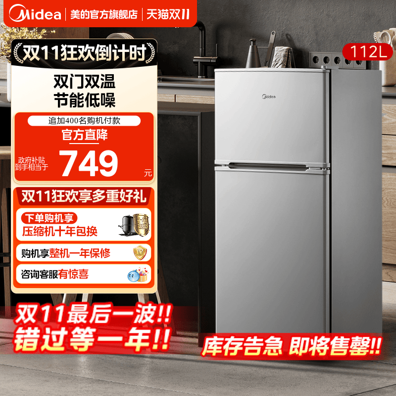 美的112L小冰箱迷你双门节能省电小型家用官方出租房宿舍办公室