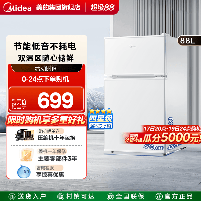 美的冰橱88升双门小型冰箱两门办公室节能电租房宿舍冷冻藏家用