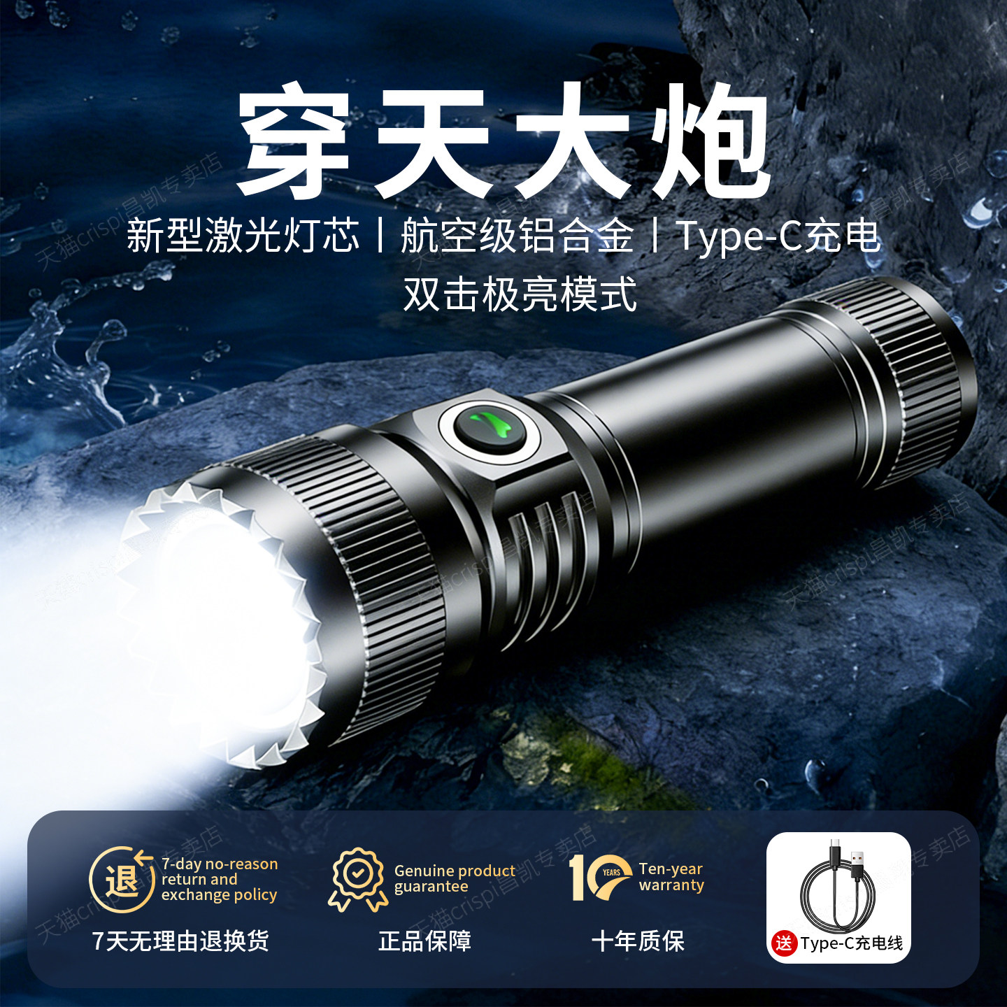 高强度强光手电筒超亮户外长续航大容量家用耐用激光充电防水电筒