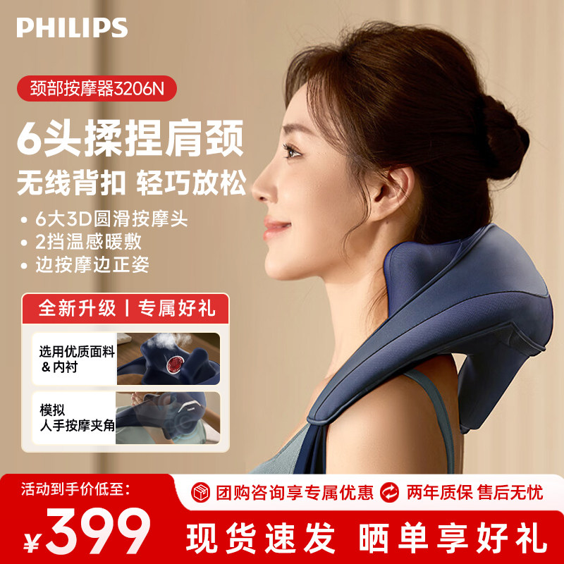 飞利浦颈椎按摩器肩颈腰背部披肩按摩仪女神节礼物PPM3206N