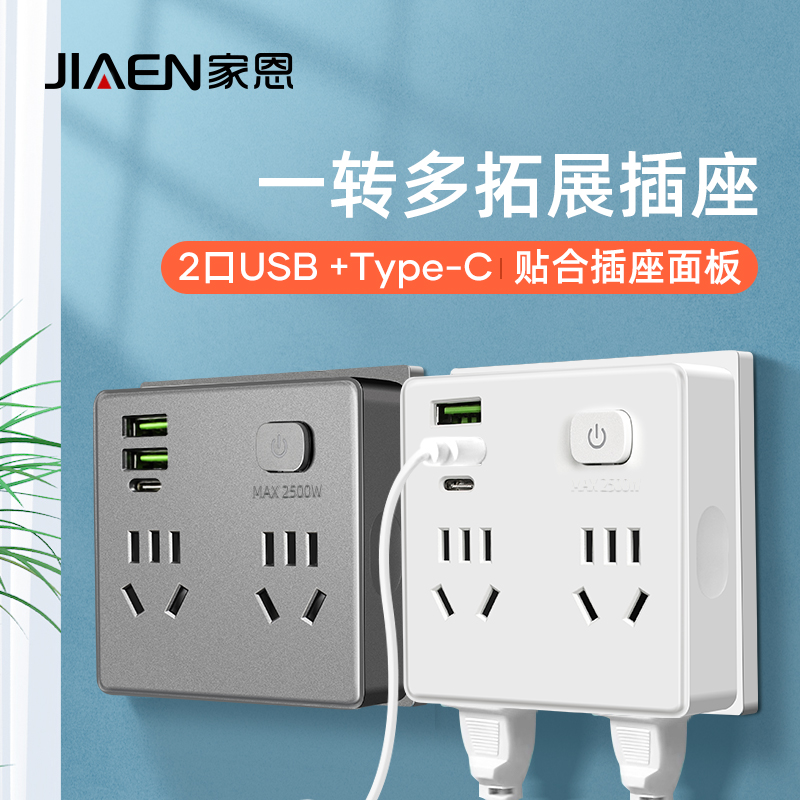 公正午纯铜插座带USB快充接线板办公家用独立开关一转多智能插排