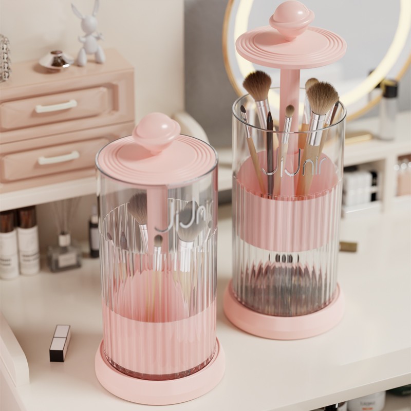 粉色旋转按压化妆刷收纳筒防尘梳妆台化妆品盒眉笔刷子桶自动升降
