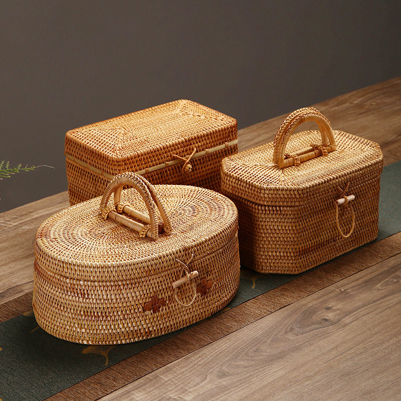 越南藤编复古竹编收纳盒手提盒茶具收纳箱带盖物品整理箱化妆品盒
