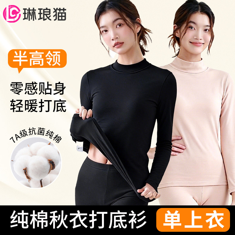 中领打底衫女纯棉保暖内衣上衣半高领女士秋衣秋裤套装薄款棉毛衫