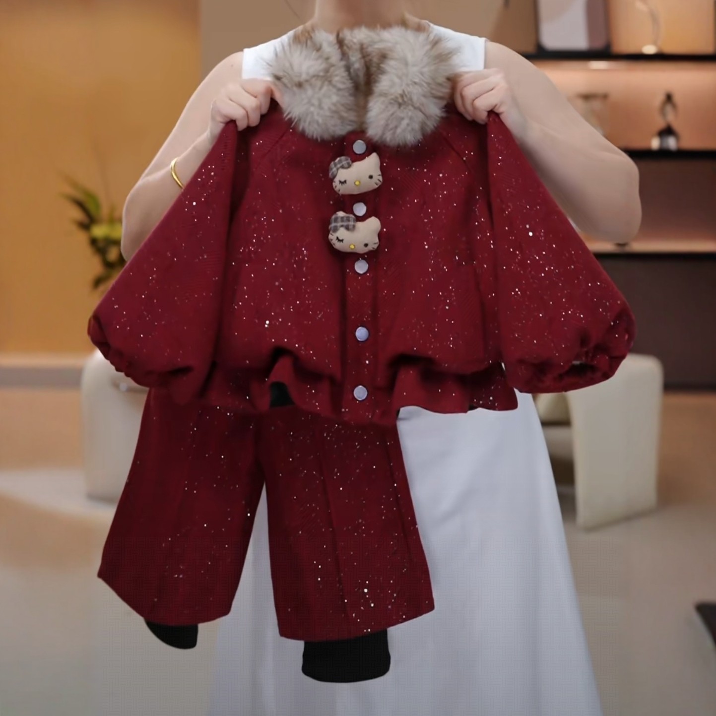 女童加绒加厚款红色毛呢套装新款冬装儿童过年服保暖翻领洋气外套