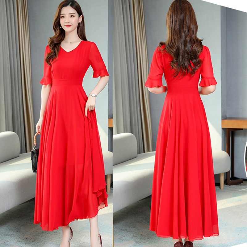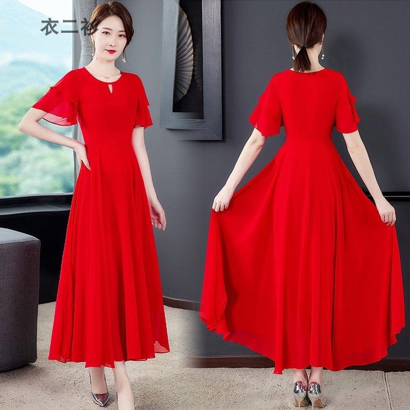 夏季雪纺连衣裙海边度假海南三亚裙显瘦时尚气质红色短袖沙滩长裙