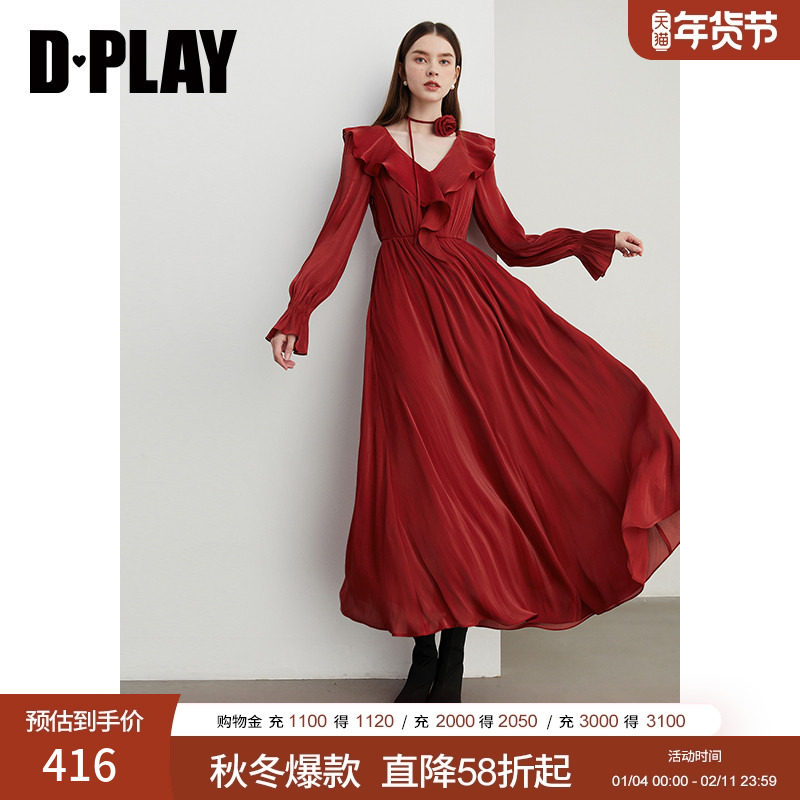 DPLAY2025秋季新款法式红色连衣裙女气质收腰长袖长款女沙滩裙