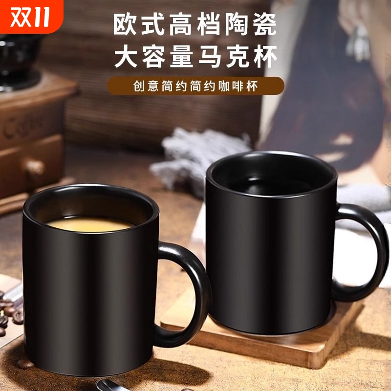创意黑色大容量马克杯子磨砂简约咖啡杯带勺陶瓷水杯精致轻奢高温