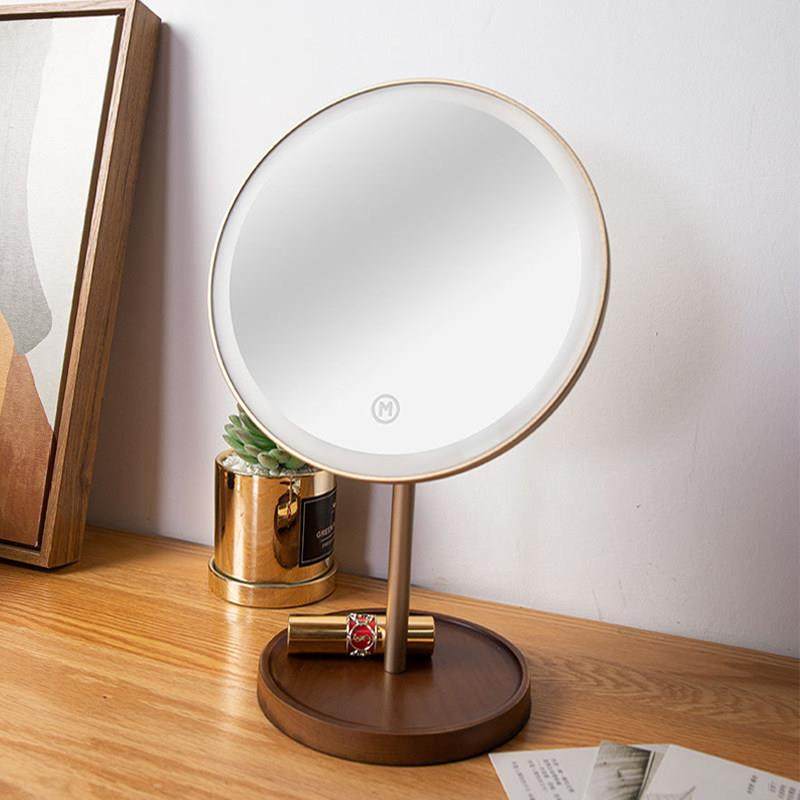 木质化妆镜LED带灯三色补光美妆镜圆形旋转卧室桌面台式化妆镜子