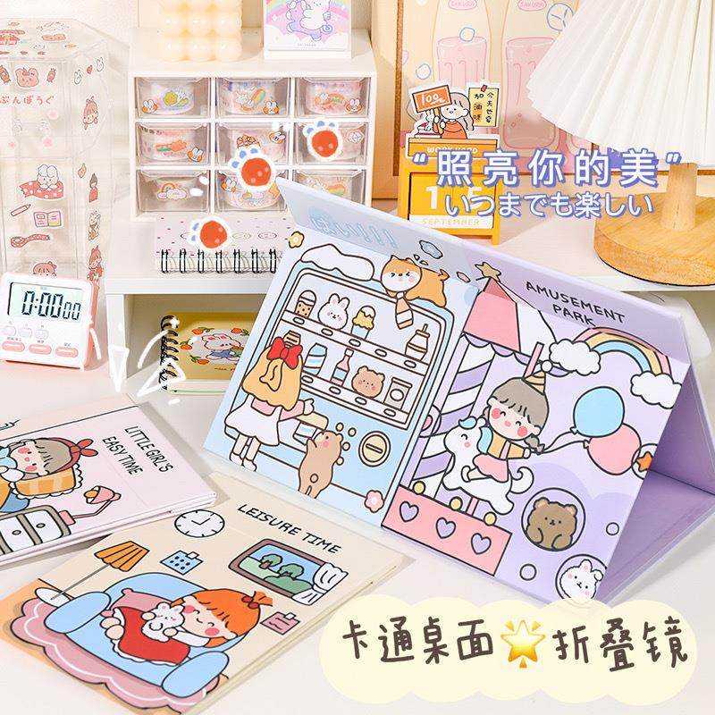 台式化妆镜子桌面可立大号卡通折叠镜女便携宿舍学生纸镜随身梳妆