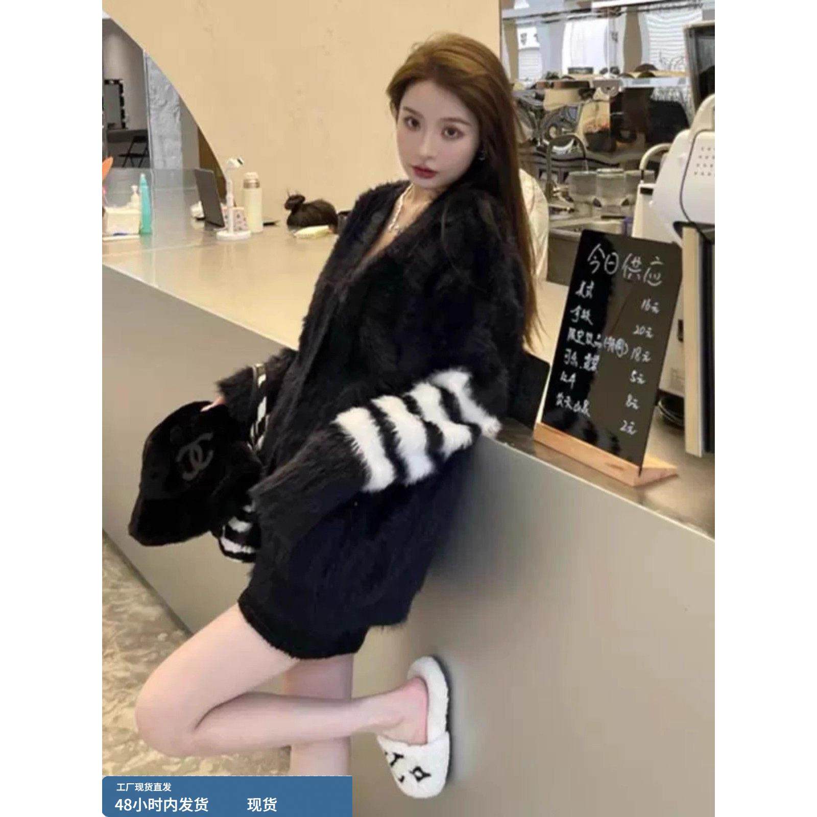 黑色v领水貂绒毛衣开衫女秋冬欧货慵懒风中长款针织条纹加厚外套