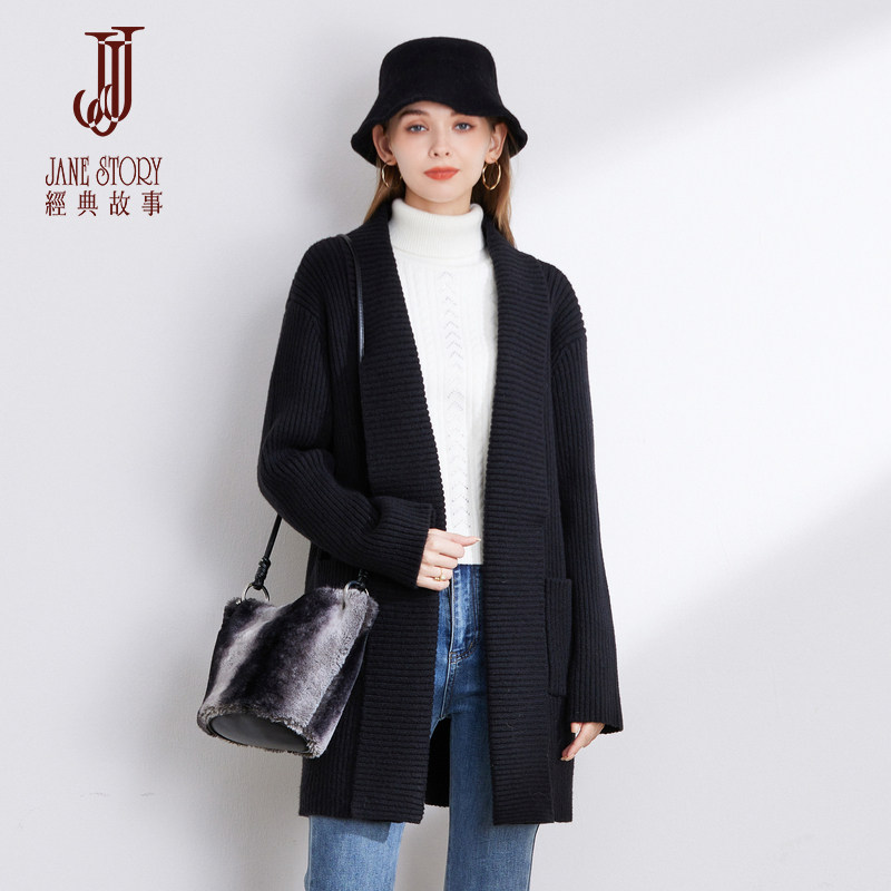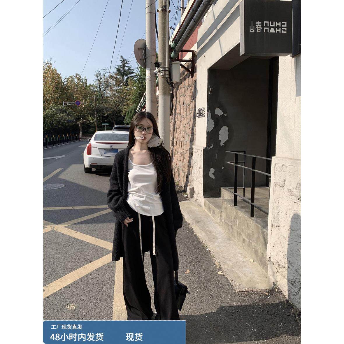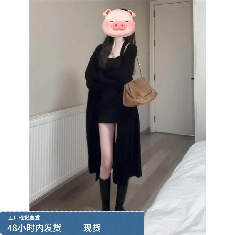 慵懒风时尚中长款针织衫女秋冬季毛衣开衫外套黑色长袖上衣外套潮